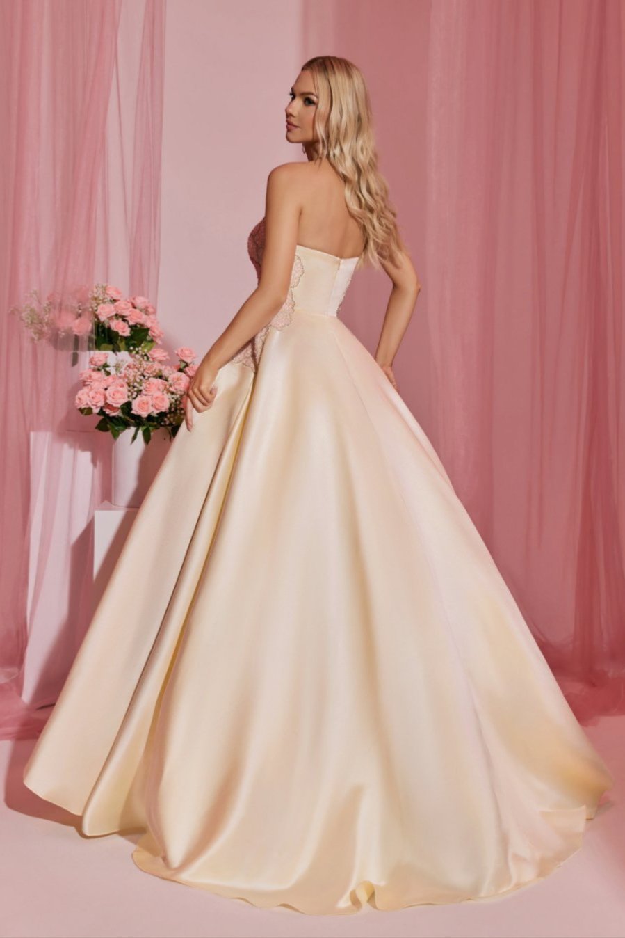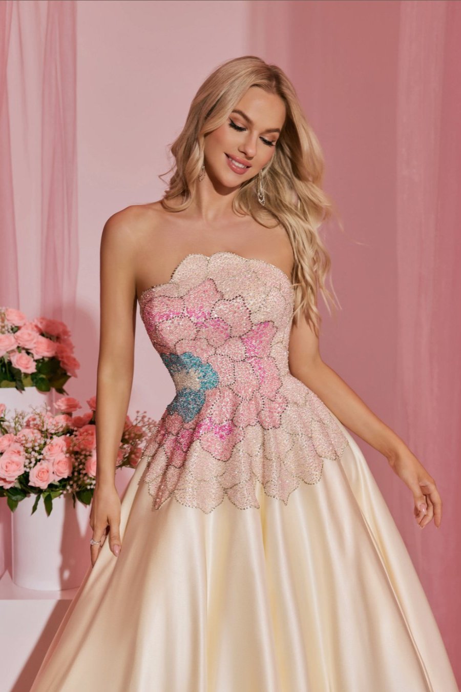 "جميع الشك والتطريز الموجود في الفستان منفذ يدويًا 100%."